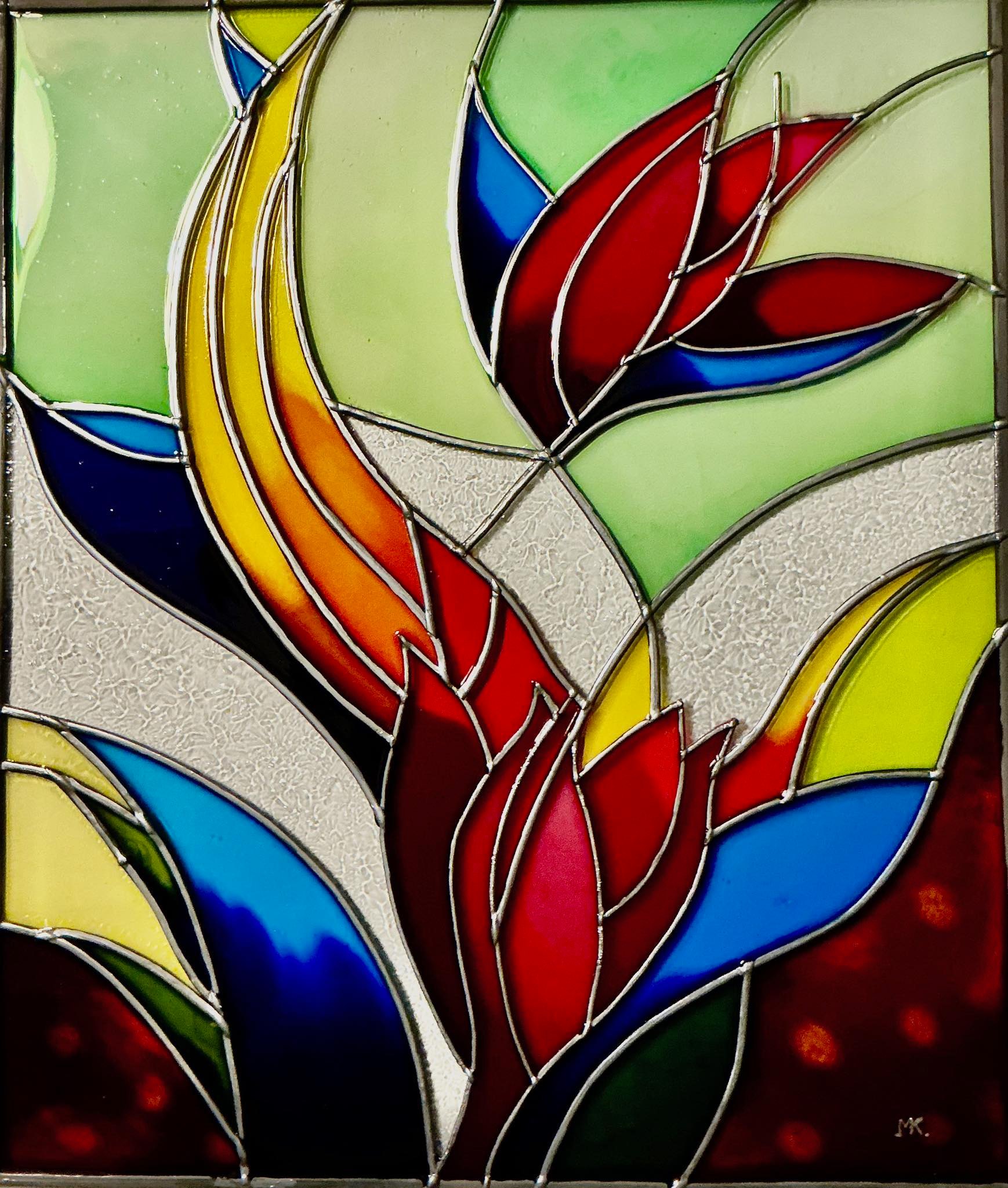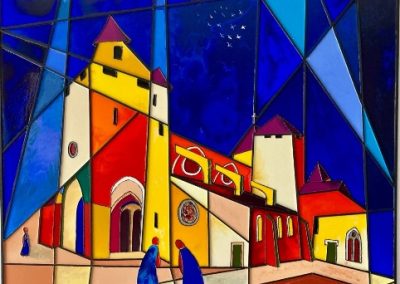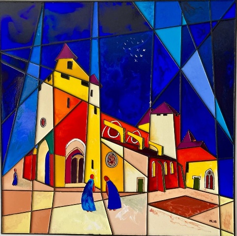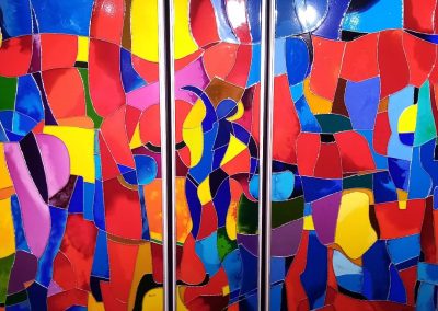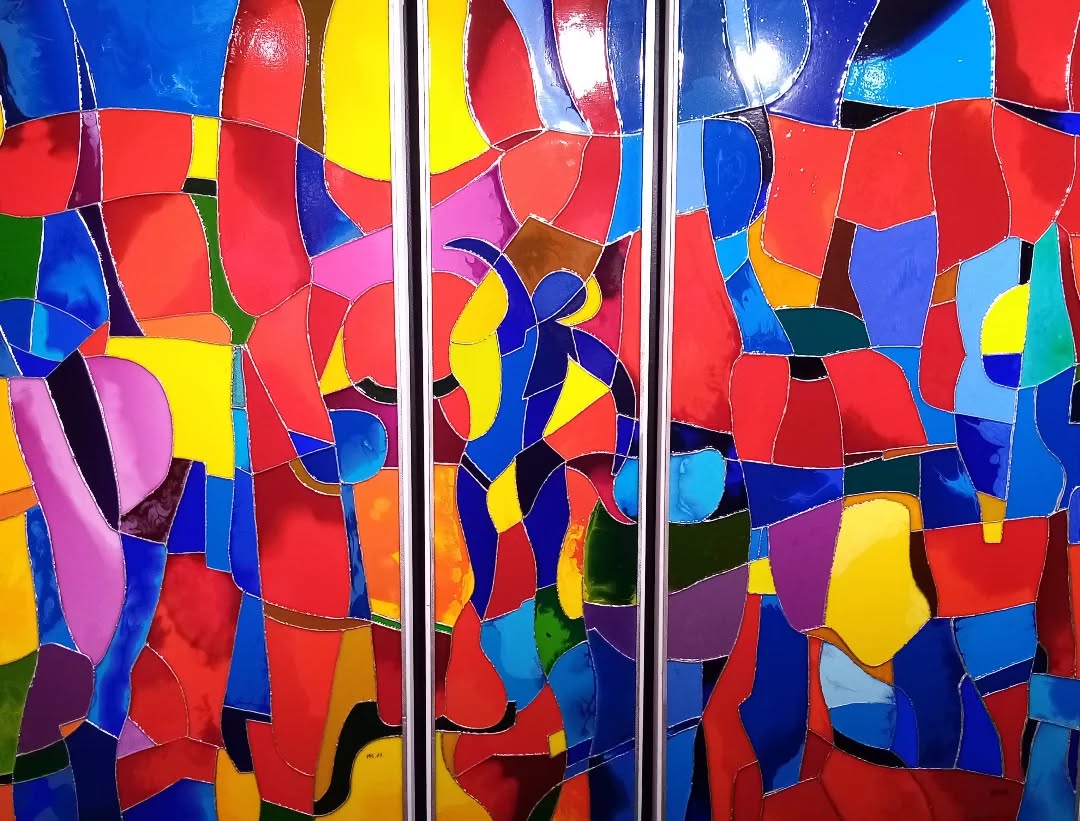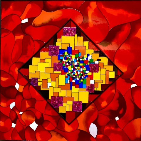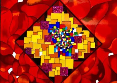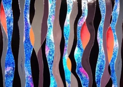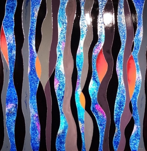 Mes toiles se caractérisent par un travail minutieux à partir d’encres, fluides acryliques dont un médium de lissage; des collages bois et reliefs sur une géométrie graphique type vitrerie. J’ai donc ainsi évolué vers la création en parallèle, de vitraux selon là encore, une technique originale.
